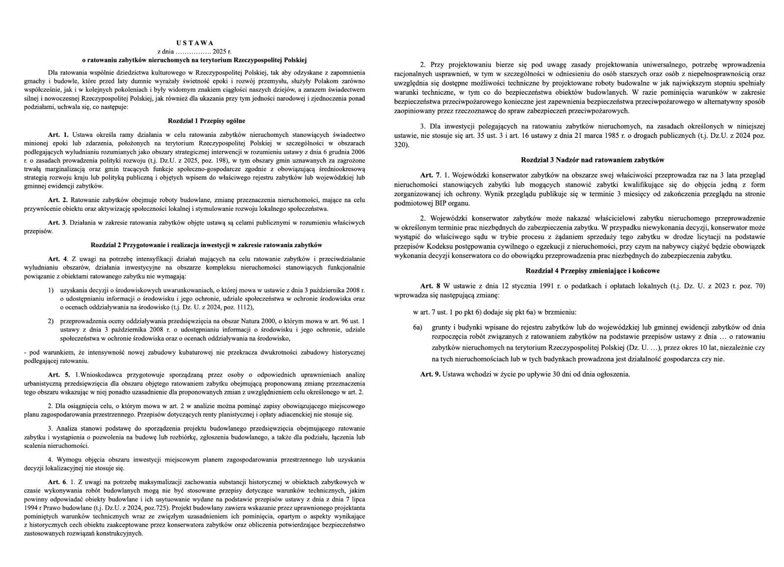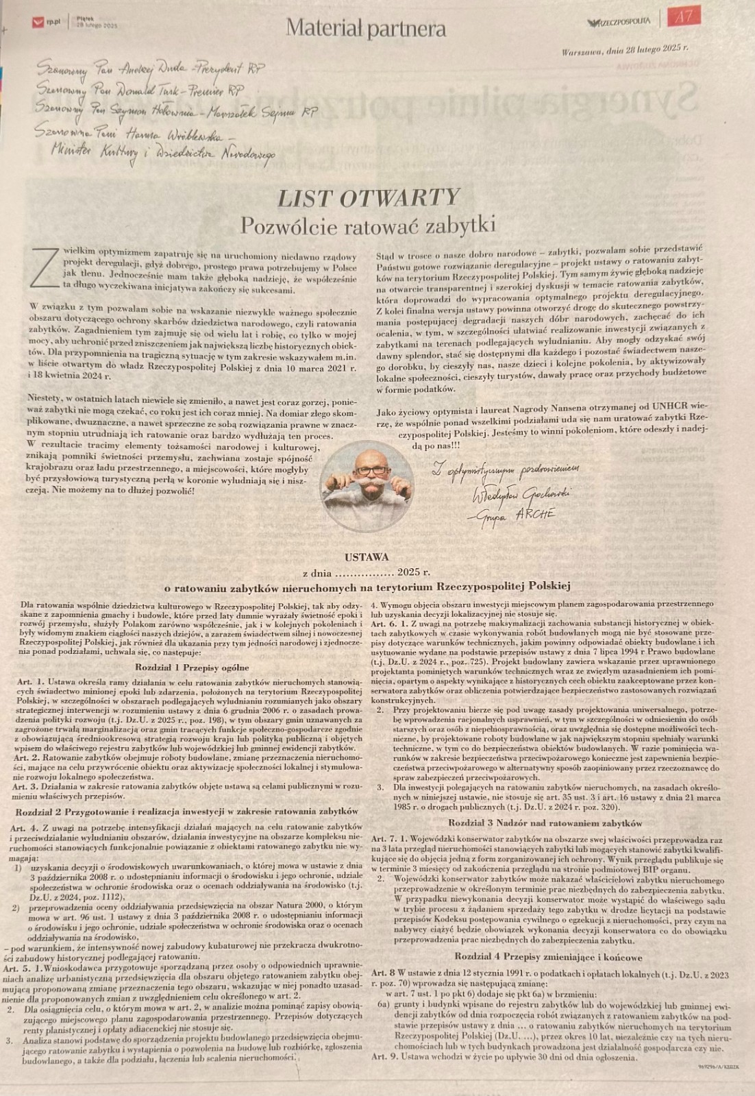 Stąd w trosce o nasze dobro narodowe — zabytki, pozwalam sobie przedstawić Państwu gotowe rozwiązanie deregulacyjne — projekt ustawy o ratowaniu zabytków na terytorium Rzeczypospolitej Polskiej. Tym samym żywię głęboką nadzieję na otwarcie transparentnej i szerokiej dyskusji w temacie ratowania zabytków, która doprowadzi do wypracowania optymalnego projektu deregulacyjnego. Z kolei finalna wersja ustawy powinna otworzyć drogę do skutecznego powstrzymania postępującej degradacji naszych dóbr narodowych, zachęcać do ich ocalenia, w tym w szczególności ułatwiać realizowanie inwestycji związanych z zabytkami na terenach podlegających wyludnianiu, by mogły odzyskać swój dawny splendor, stawać się dostępnymi dla każdego i pozostać świadectwem naszego dorobku, by cieszyły nas, nasze dzieci i kolejne pokolenia, by aktywizowały lokalne społeczności, cieszyły turystów, dawały pracę oraz przychody budżetowe w formie podatków.